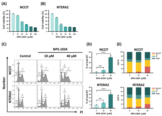Analysis of TC cell survival with NPS-1034 treatment. The MTT assay was used to determine TC cell viability in (A) NCCIT and (B) NTERA2 cell lines treated with NPS-1034 (10, 20, 40, 80, and 160 µM) and DMSO (control) for 24 h. (C) Cell cycle analysis was performed to evaluate changes in each phase of NCCIT and NTERA2 cell lines treated with NPS-1034 at 10 and 40 µM for 48 h. (D) An increase in the sub-G1 phase can be observed in both cell lines after NPS-1034 treatment. (E) The proportion of the cell cycle was quantified in the segments of the bar chart. The data are presented as mean ± SD (** p < 0.01; *** p < 0.001).