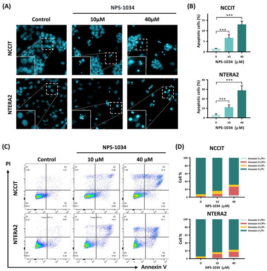 To consolidate the hypothesis that NPS-1034 facilitates apoptosis, a fluorescence microscopy analysis was performed with Hoechst stain 33,342. As shown in Figure 2A,B, an increase in intensified blue fluorescence dots can be observed in cells treated with NPS-1034 (10, 40 µM) for 24 h. The bright blue fluorescence dots in Figure 2A visualized the condensed chromatins, suggesting an increase in apoptotic cells. The result of fluorescence microscopy was quantified in a bar chart (Figure 2B). The percentage of apoptotic NCCIT cells treated with NPS-1034 at 40 µM rose from 1.43 ± 0.23% to 12.80 ± 1.71%, compared to the control group (NCCIT: control vs. 10 and 40 µM, p = 0.001 and 0.001, respectively), while apoptotic NTERA2 cells escalated from 2.79 ± 1.35% to 28.46 ± 5.51% in groups treated with NPS-1034 at 40 µM (NTERA2: control vs. 10 and 40 µM, p = 0.001 and 0.001, respectively). To clarify the cause of cell death, additional flow cytometry analysis was used to evaluate cell death driven by NPS-1034 with Annexin V/PI dual staining (Figure 2C). The sections in the columns in Figure 2D represent the percentage of early and late apoptotic cells after a 48-h NPS-1034 treatment, from 6.27 ± 1.18% to 26.68 ± 5.91% in NCCIT cell lines compared with the control group (NCCIT: control vs. 10 and 40 µM, p = 0.001 and 0.004, respectively). As for the NTERA2 cell line, the rate of apoptotic cells rose from 5.15 ± 0.54% to 17.94 ± 1.45% (NTERA2: control vs. 10 and 40 µM, p = 0.001 and 0.001, respectively). The accumulation of apoptotic cells at different stages complies with the result in Figure 2A,B, indicating the potency of NPS-1034 in inducing cellular apoptosis in TC.