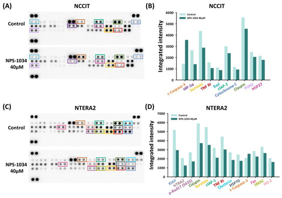 An apoptosis array examined the expressions of proteins involved in cell death caused by NPS-1034. Both (A) NCCIT and (C) NTERA2 cell lines were tested with an apoptosis array. The expressions of proteins were quantified into bar charts, as shown in (B,D). The proteins were aligned based on the extent of changes in the protein expressions before and after NPS-1034 treatment.