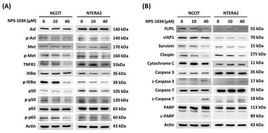 NPS-1034 potentially triggered an apoptotic pathway in TC cell lines via the TNFR1 pathway. (A) NPS-1034 inhibits the p-Axl, p-Met and downstream pathway NF-κB of TNFR1, which might lead to certain gene expressions in both NCCIT and NTERA2 cell lines. (B) Proteins involved in the apoptotic pathways were determined following the treatment of NPS-1034 in TC cell lines.