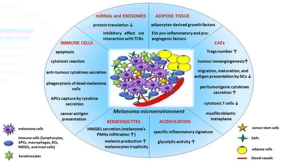 - Simiczyjew, A.; Dratkiewicz, E.; Mazurkiewicz, J.; Ziętek, M.; Matkowski, R.; Nowak, D. The influence of tumor microenvironment on immune escape of melanoma. Int. J. Mol. Sci. 2020, 21, 8359. [Google Scholar] [CrossRef] [PubMed]