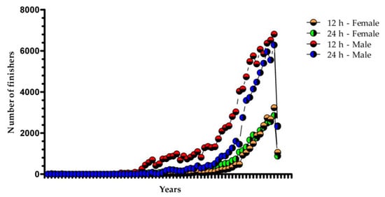 Figure 1 presents the trend in athletes’ participation in 12 h and 24 h ultra-marathons for both sexes. In general, for both sexes and events, an increase in the number of participants over the years was observed, with a greater increase during the last decade, especially for male runners. However, in 2020, a decrease in the number of runners was observed due to the COVID-19 pandemic, which led to the reduction of sports events all over the world.