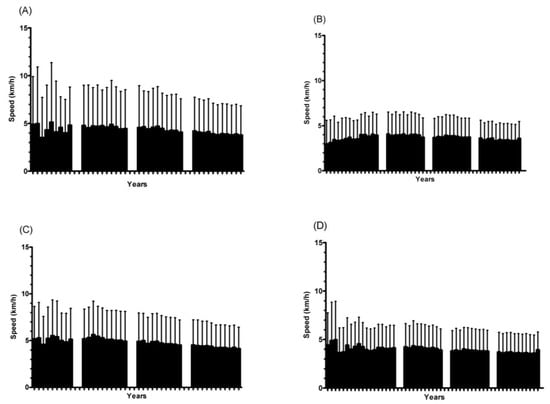 Running speed for ultra-marathoners of both sexes and events ((A) female 12 h; (B) female 24 h; (C) male 12 h; (D) male 24 h).
