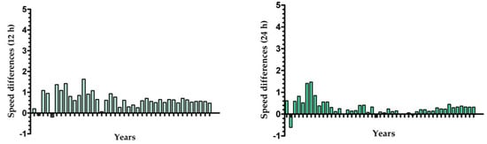 Trends in performance and sex differences in performance are presented below (Figure 2 and Figure 3). For both sexes and events, a decrease in running speed was observed across the years. Considering the first and the last year of participation, the highest difference in running speed was found for male athletes in the 12 h events (−4.65 km/h), while the lowest difference was observed for male athletes in the 24 h events (−1.37 km/h). Sex differences in performance are presented in Figure 3. For both events, sex differences in performance decreased over time. In general, male runners performed better than female runners, but the lowest differences in recent years were observed for 24 h ultra-marathons, where female runners performed better than their male peers in three years (1986, 2003 and 2006). On the other hand, during the first years, the highest sex differences in performance were also observed among athletes in the 24 h ultra-marathons, favoring male runners.