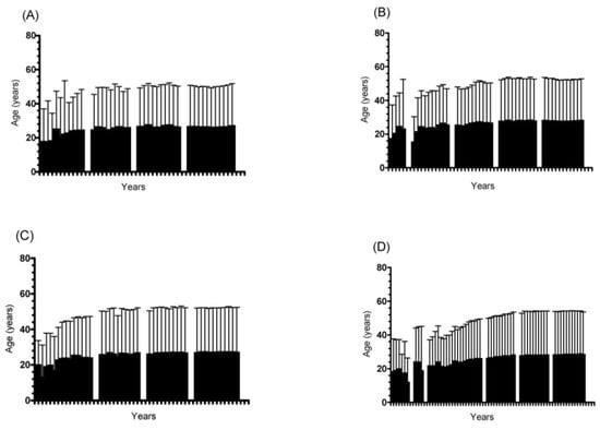 Changes in age across the years are presented in Figure 4 for both sexes. When considering the total sample, regardless of sex and/or time-limited ultra-marathons, a positive trend in age across the years was found with an increase and stabilization in mean age (“<1989” = 40.33 ± 10.07 years; “1990–1999” = 44.16 ± 10.37 years; ”2000–2009” = 45.99 ± 10.33 years; “2010–2020” = 45.62 ± 10.80 years).