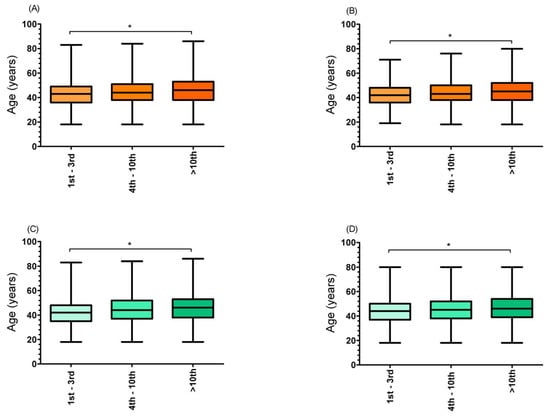 Age of peak performance, by ranking position. ((A) 12 h female runners; (B) 24 h female runners; (C) 12 h male runners; (D) 24 h male runners) * Significant differences between all groups.