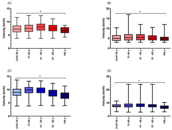 Differences in performance according to age groups. ((A) 12 h female runners; (B) 24 h female runners; (C) 12 h male runners; (D) 24 h male runners). * Significant differences between age categories.