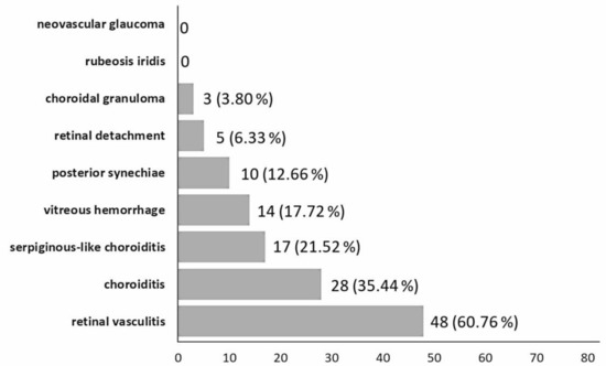 The clinical manifestations comprised of 48% (38 eyes) posterior uveitis, 37% (29 eyes) panuveitis, and 15% (12 eyes) intermediate uveitis. In the sample, 55% cases were bilateral and 45% unilateral. There was 60.76% retinal vasculitis, 35.44% choroiditis (discrete choroidal lesions), 21.52% serpiginous-like choroiditis (multifocal lesions that develop in a serpiginoid pattern and merge), 17.72% vitreous hemorrhage, 12.66% posterior synechiae, 6.33% tractional retinal detachment, and 3.80% choroidal granuloma. No rubeosis irides or neovascular glaucoma was recorded (Figure 1). Vitreous hemorrhage and tractional retinal detachment could be complicated from retinal neovascularization but hard to confirm without the assistance of ultrawidefield fluorescein angiography. There was no recording of macular edema, papillitis, or choroidal neovascular complications.
