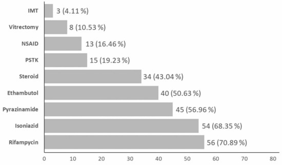 The treatment modalities included 70.89% rifampicin, 68.35% isoniazid, 56.96% pyrazinamide, 50.63% ethambutol, 43.04% oral steroid, 19.83% posterior triamcinolone, 16.46% non-steroidal anti-inflammatory drugs (NSAIDs), 10.53% vitrectomy, and 4.11% immunosuppressants (Figure 2). Some authors performed MTB PCR on vitrectomy fluid but there were no detailed clinical data.