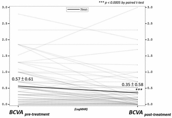The significant BCVA improvement after treatment. *** p < 0.0005 by paired t-test.