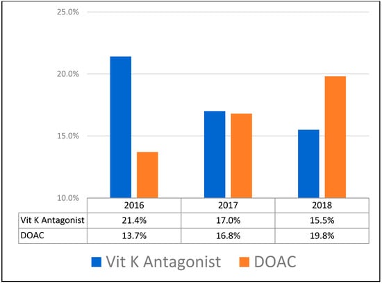 Comparison of the prevalence of Vitamin K Antagonist and DOAC treatment at admission over the study period 2016–2018 (percentage of all anticoagulated patients).