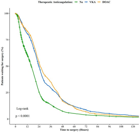 As shown in Figure 2, no difference regarding the time-to-surgery was seen between patients on DOACs or VKA (patients waiting for surgery after 24 h: 54% vs. 50%). However, patients who did not take any anticoagulation underwent significantly earlier surgery, namely 25% after 24 h after admission (p < 0.001).