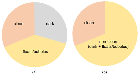 Figure 2. Schemes for each capsule endoscopy (CE) image class. Each color represents an individual region in a CE image. (a) 3-class: separate clean, dark, and floats/bubbles regions. (b) 2-class: Dark and floats/bubbles regions merged into a single class.