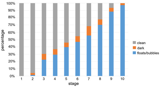 Among the 179 CE studies (approximately over 8 million small bowel frames) from 179 patients, 10,033 frames of images were selected. In addition, 10,033 frames were split into 10 stages according to their clean region size. Figure 3 plots the class balance using the percentage of mean size for each class (floats/bubbles, dark, and clean) according to the stage number, and shows that the size of the clean region decreases linearly with the stage number. The mean age of patients was 46 ± 26 years (median: 52.2 years, range: 6.2–88.3 years), the mean body surface area was 1.6 ± 0.2 m2 (range: 0.7–2.3 m2), and 62% of the participants were male. A median of 35 frames (16, 65, IQR) and an average of four stages were extracted per person.