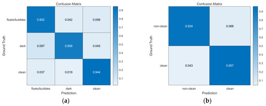 Figure 4. Pixel-level confusion matrix of our semantic segmentation algorithm based on DeepLab v3. (a) 3-class. Clean region exhibited better accuracy compared to other regions. (b) 2-class. Both clean and non-clean regions were fairly well classified correctly.