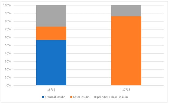 In Group-15/16, prandial insulin was started significantly more often, which means that patients had higher recommended postprandial glycemic levels (120 mg/dL; self-monitoring) (Table 5 and Figure 1). In Group-17/18, insulin was started significantly less often and basal insulin was mostly initiated (Table 5). The authors believe that less frequent inclusion of prandial insulin in Group-17/18 was related to the change in the postprandial glycemic threshold to 140 mg/dL.