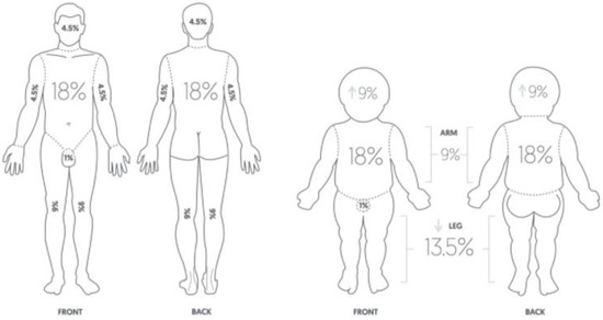 - Moore, R.A.; Waheed, A.; Burns, B. Rule of Nines; StatPearls Publishing: Treasure Island, FL, USA, 2021. [Google Scholar]
