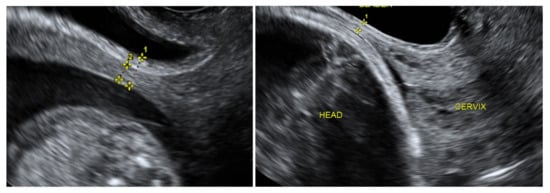 - Montanari, L.; Alfei, A.; Drovanti, A.; Lepadatu, C.; Lorenzi, D.; Facchini, D.; Iervasi, M.T.; Sampaolo, P. Transvaginal Ultrasonic evaluation of the thickness of the section of the uterine wall in previous cesarean sections. Minerva Ginecol. 1999, 51, 107–112. [Google Scholar] [PubMed]