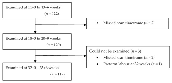 A total of 122 eligible participants were included in the study at the first trimester of pregnancy. Sonographic data were obtained from 120 participants who attended scans at the first and second trimesters and 117 of these attended all three scans (Figure 3). Complete sonographic data were obtained from 117 participants who attended all scans during pregnancy.