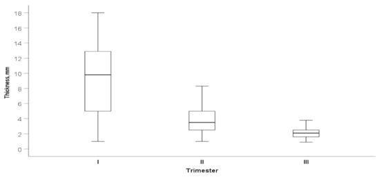 Of the 63 women who underwent a trial of labor after one previous CS, 41 (65.0%) had a successful vaginal delivery. In the patient group with CS scar niches (n = 49) compared to the non-niche group (n = 46), there were no statistical differences in the type of delivery. A total of 19 women had successful trials of labor in the niche group and 22 in the non-niche group (38.7% vs. 47.8%, p = 0.802).The median neonatal weight did not differ between women groups according to the CS scar niche as Apgar score. No significant association was found between CS niche and maternal age, BMI, gestational diabetes, smoking status, and previous vaginal birth (Table 2). Demographic and main obstetric history of the study participants in the CS scar niche group and non-niche group is shown in Table 2. Overall, the median CS scar myometrial layer thickness in the study population (CS scar niche group and non-niche group) reduced from 9.9 mm during the first trimester to 2.1 mm in the third trimester of pregnancy (p < 0.001) (Figure 4).