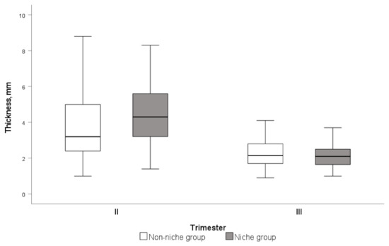 The median and 25th–75th percentile for RMT, myometrial thickness near the internal os at the first trimester, and full LUS as myometrial LUS thickness was calculated for the second and third trimester of pregnancy. These characteristics were compared between the first, second, and third trimesters using two-way Friedman’s ANOVA test. For paired samples, to compare LUS myometrial thickness at the second and third trimester in the CS scar niche group and non-niche group, we used Wilcoxon Signed Rank test. The change in percentage was calculated using Mann–Whitney test (scar myometrial thickness at the third trimester—scar myometrial thickness at second trimester/myometrial thickness at the second trimester × 100%. The more negative result—the more significant decrease in CS scar thickness).