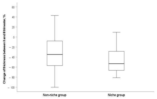 Change in myometrial LUS thickness between the second and third trimester of pregnancy in the CS scar niche group and non-niche group. Data shown as percentage (the more negative percentage, the more significant decrease in myometrial LUS thickness).