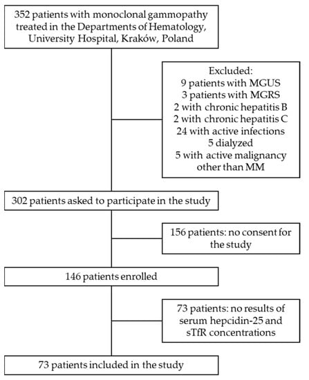 Seventy-three patients (35 females), aged between 29 and 90 years old, were recruited (Figure 1). Six patients (8%) were diagnosed with smoldering myeloma (SMM) and 67 patients (92%) with symptomatic MM. Forty patients (55% of the studied group) were classified to have stage I disease according to International Staging System for multiple myeloma (ISS) [13]. Eight patients (11%, including the subjects diagnosed with SMM) were treatment naïve upon presentation. Most patients (n = 65; 89%) had received at least one line of treatment and 23 (32%) had a history of prior autologous peripheral blood stem cell transplantation. Fifty-two patients (71%) were in complete or partial remission. Fourteen patients (19%) had anemia defined as blood hemoglobin below sex-related lower reference limit (i.e., <11 g/dL in women and <12 g/dL in men). Patients with anemia more commonly received maintenance treatment and demonstrated a worse response to the treatment, as compared to subjects with normal blood hemoglobin (Table 1), while other baseline clinical characteristics were similar across the groups.