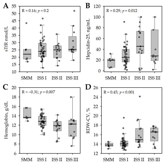 Soluble transferrin receptor (sTfR, A), hepcidin-25 (B), blood hemoglobin (C), and red cell distribution width–coefficient of variation (RDW-CV, (D)), among 73 studied patients with multiple myeloma (MM) according to increasing stage of the disease: from smoldering multiple myeloma (SMM) to International Staging System for MM (ISS) stage III. The data are shown as median (central line), interquartile range (box), non-outlier range (whiskers), and outliers (points). Spearman correlation coefficients (R) and p-values describe the correlations of the studied variables (shown on the Y-axis) with ordered scale of increasing severity of MM (from SMM to ISS stage III MM, as shown on the X-axis).