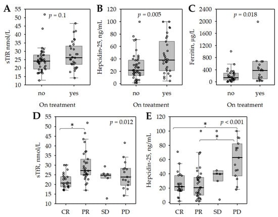 Soluble transferrin receptor (sTfR, (A)), hepcidin-25 (B), and ferritin (C) in serum of studied patients with MM according to treatment status; serum sTfR (D) and hepcidin-25 (E) in patients with MM according to the response to treatment. The data are shown as median (central line), interquartile range (box), non-outlier range (whiskers), and outliers (points); p-values in Mann–Whitney (A–C) or Kruskal–Wallis (D,E) test are shown, asterisk depicts significant differences in post-hoc comparisons.
