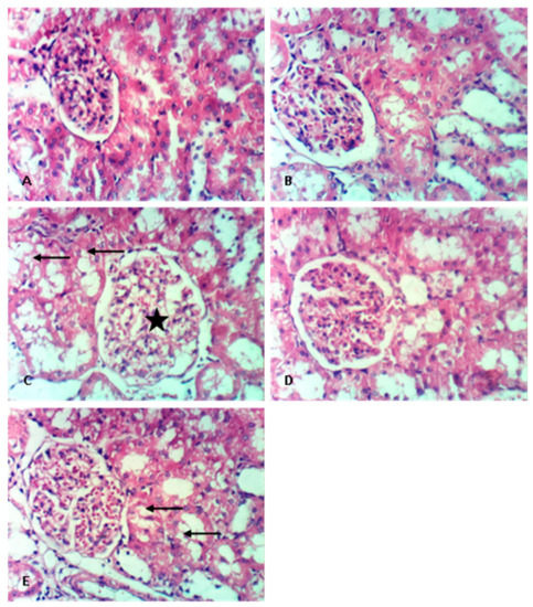 Effect of rosuvastatin (RSV) on renal histopathological changes in diabetic nephropathy (DN) in rats. Rat renal photomicrographs (400×) of (A) control, (B) RSV, (C) DN, (D) DN/RSV and (E) DN/RSV/zinc protoporphyrin-IX groups. Black arrow: vacuolation of epithelial lining renal tubules; star: distorted glomerulus.