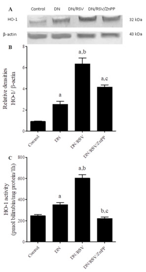 Here, the present study shows that RSV has hemin-like stimulatory effect on renal HO-1 expression and/or activity in DN rats. At the expression level, RSV was previously reported to induce HO-1 expression in vitro in neuro-2A cells exposed to lipopolysaccharide [55], cultured HL-1 cell line of atrium-derived myocytes [56], in aortic tissue of AngII-ApoE-/- murine animal model [57], umbilical vein endothelial cells [58] and myocardial hypertrophy in rats [59]. Concerning the effect on HO-1 activity, RSV was also reported to have stimulatory effect on HO-1 activity on different other tissues as the lungs [60]. However, this is not indicative of how RSV may affect HO-1 in the kidney, as RSV was reported to have differential effect on HO-1 activity in various tissues, where it increased HO-1 activity in heart > lung > brain, with no effect on the liver [61], indicating that RSV effect on HO-1 activity is organ-specific.