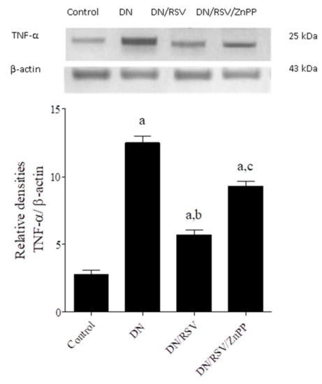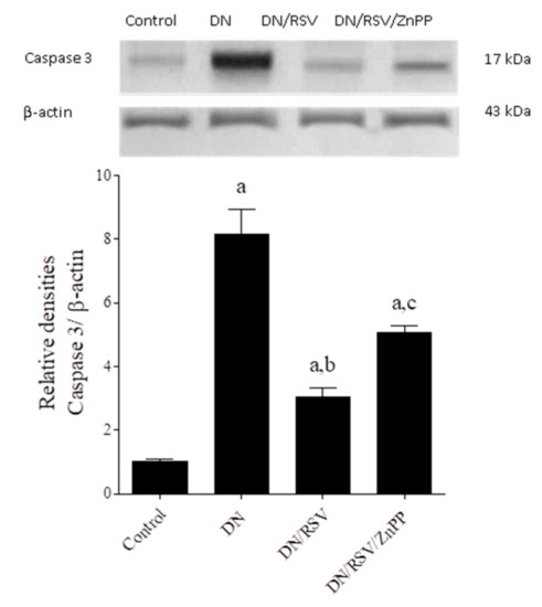 Renal expression of TNF-α and caspase 3 was assessed by Western blot and showed that the DN group had a significantly higher expression level of both proteins compared to the control (Figure 3 and Figure 4, respectively). Administration of RSV to DN rats caused a significant decrease in renal expression of both proteins compared to the DN group, while co-administration of ZnPP with RSV to DN rats caused a significant increase in the expression level of both proteins compared to the DN/RSV group.