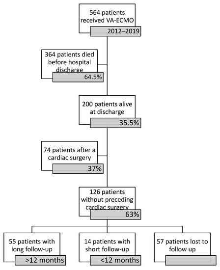 Despite widely available results for short-term survival rates, only limited data are presented for longer-term outcomes after successful support with VA-ECMO [,,]. The fate of survivors remains unknown after discharge. Our study, therefore, sought to analyze the indications, pre-implantation status, and outcome of non-cardiac surgical patients who survived VA-ECMO therapy. The purpose of our investigation was to evaluate the duration of survival and to assess the complications after discharge from the clinic and to answer the question of whether an event-free follow-up is possible in patients successfully therapied with VA-ECMO.