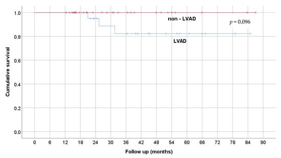 The outcomes of survivors were compared between LVAD recipients and patients discharged without MCS, as shown in Table 4. The duration of VA-ECMO support, hospital stay, and length of follow-up wasnot significantly different between groups. According to the characteristic data shown in Table 4, only exacerbations of chronic heart failure occurred significantly (p = 0.001) and more often in the subpopulation bridged with LVAD. The Kaplan–Maier survival curve of patients who had left the hospital alive is shown in Figure 2.