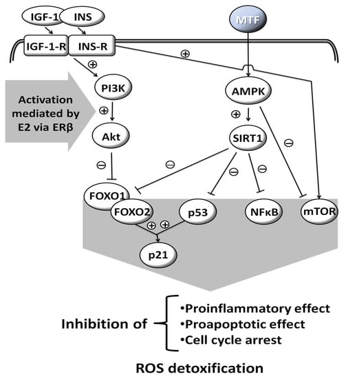 Molecular responses that are elicited by MTF; some are influenced by sex hormones. Insulin-like Growth Factor-1, INS: Insulin, IGF-1-R: Insulin-like Growth Factor-1-Receptor, INS-R: Insulin Receptor, PI3K: Phosphoinositide 3-kinase, Akt: Serine/threonine protein kinase B, AMPK: AMP-activated protein kinase, SIRT1: Sirtuin 1, FOXO1: Forkhead box protein O1, FOXO2: Forkhead box protein O2, p53: Tumor protein p53, NFκB: Nuclear factor kappa-light-chain-enhancer of activated B cells, mTOR: Mammalian target of rapamycin, p21: Cyclin-dependent kinase inhibitor 1, ROS: Reactive oxygen species, E2: Estradiol, ERβ: Estrogen receptor β, (+): activation, (−): inhibition, drawn with data from [,,,].