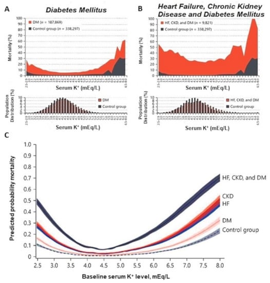 - Collins, A.J.; Pitt, B.; Reaven, N.; Funk, S.; McGaughey, K.; Wilson, D.; Bushinsky, D.A. Association of serum potassium with all-cause mortality in patients with and without heart failure, chronic kidney disease, and/or diabetes. Am. J. Nephrol. 2017, 46, 213–221. [Google Scholar] [CrossRef] [PubMed]