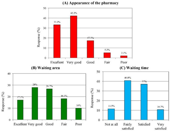 Customers’ views on pharmacy appearance (A), waiting area (B) and busyness (C).
