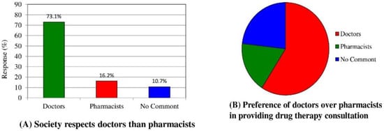 When the customers were asked about their perception of the pharmacist’s job as compared to doctors, most (73.1%) stated that society respects doctors more than pharmacists (16.2%), as shown in Figure 4A. About 59.1% of respondents preferred doctors to pharmacists for the provision of drug therapy consultation (Figure 4B).