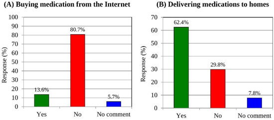 Categorical distribution of respondents’ responses to question on buying medicines over the Internet (A) and home delivery of medicines (B).