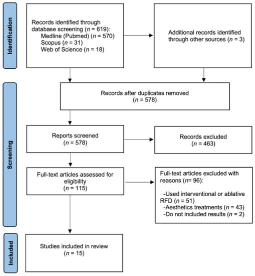 The PRISMA flow chart (Figure 1) shows the study selection process. Six-hundred-nineteen studies were found among PubMed, Scopus and Web of Science, which were added to another three found by references. From those, 44 were discarded as duplicates. The title and abstract of the remaining 578 were screened and 463 were excluded due to the selection criteria. In the end, 100 more studies were excluded after reading the whole text, obtaining 15 studies that met the inclusion criteria [,,,,,,,,,,,,,,].