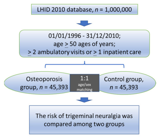 Both osteoporosis and TN share similar pathophysiological mechanisms and risk factors. Firstly, both their risks are positively associated with aging, have a similar age of onset [3,10,11], and, both occur more frequently in females than in males. Secondly, because TN patients often have vascular diseases such as atherosclerosis and arterial hypertension, a vascular theory for TN etiology has emerged [3,4,12]. Osteoporosis and atherosclerosis share some common features, including oxidized lipid accumulation and endothelial dysfunction [14]. Studies suggest that patients with hypertension have a far greater risk for both TN and osteoporosis [4,6]. In addition, chronic inflammation involving pro-inflammatory cytokines is known to play a major role in the development of both long-term conditions [14]. Wu et al. (2017) previously suggested that osteoporosis easily develops in patients with the chronic inflammatory skin disease atopic dermatitis [15]. The release of IL-1, IL-6, NO, and TNF-α, and the interaction of RANKL/RANK can regulate the balance between osteoblasts and osteoclasts [16]. Additionally, vitamin D not only maintains bone mineralization [17] but also modulates pain intensity in TN patients [18]. Finally, loss of jawbone may be a presentation of osteoporosis [19,20], and jawbone cavitation is also considered as a possible pathogenesis of TN [7,8,21]. Therefore, we assumed that osteoporosis is correlated with TN and performed a population-based retrospective cohort study. We used Taiwan’s National Health Insurance Research Database (NHIRD) to determine the connection between osteoporosis and subsequent TN risk.