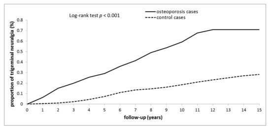 In Figure 2, the Kaplan–Meier plots for the TN cumulative incidence are compared between the osteoporosis and control cases at the 15 years follow-up. The figure reveals that the TN cumulative incidence was significantly higher in the osteoporosis group than in the control group (log-rank test p < 0.001).