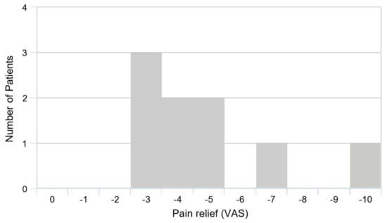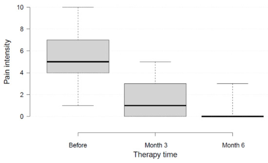 A power calculation before the study started resulted in a minimum number of four patients for a VAS pain score (scale from 0 to 10 points) with the following average values: before intervention OA pain VAS 6, after trio-therapy VAS 2, standard deviation 2, statistical significance p < 0.05, statistical power 0.8. A chi-square likely ratio test was used to assess the statistical significance of differences between the start and end of treatment. The significance level was set at α = 0.05. The results are depicted as average values with ± standard deviations and the range of minimum and maximum values. We also calculated minimal detectable changes (MDC) for a power of 0.8.