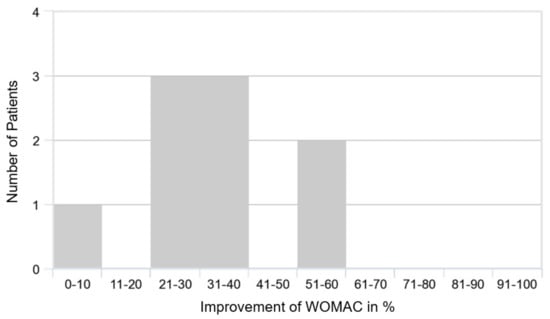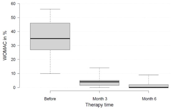 Patients had initial WOMAC scores of 35 ± 15 (range, 10–56) (Figure 3 and Figure 4). During therapy, values declined to 4 ± 5 (range, 0–14; p < 0.05) after three months of therapy, and to 2 ± 4 (range, 0–9; p < 0.01) after six months. Thus, the patients achieved better scores than the normal population in this age category [27]. Five out of nine patients achieved the ideal value of 0. Most of the improvement was achieved within the first three months. The MDC of 16.2 was reached.