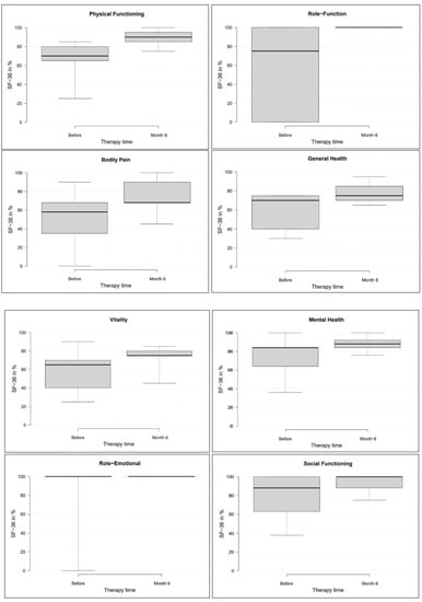 Quality of life was assessed using the short form–36 items (SF-36) questionnaire, before starting therapy and after six months [27]. This questionnaire records physical and mental health in eight domains. The four domains of physical health are physical functioning (PF), role-physical (RP), bodily pain (BP), and general health (GH). The four domains of mental health are vitality (VT), social functioning (SF), role-emotional (RE), and mental health (MH). The highest possible score per domain is 100 points, on a scale from 0 to 100 points and is achieved by healthy people without limitations or disabilities. The parts general health, vitality, and mental health are ‘bipolar’ and have a broader range in their coverage of negative and positive health states. Here, 50% is achieved with a neutral assessment (neither positive nor negative). One hundred points are achieved in these domains if the patients describe their state of health as positive [28]. The values of the US-American average population served for comparison with the study results [28].
