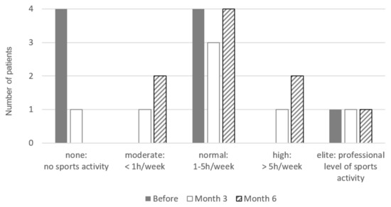 Sports physical activity increased by at least 1 level on the sports frequency score in four out of nine patients within the first three months, and six out of nine patients after six months (Figure 6). Running was most popular, followed by fitness, skiing, cycling, and tennis.