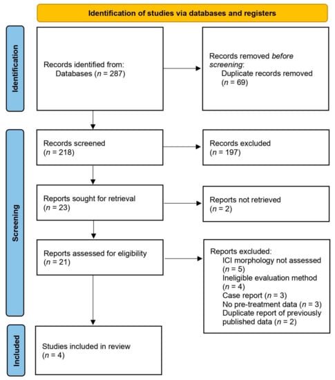 The electronic database search identified 287 records of our interest. After duplicate removal, 218 records remained, which were screened for relevance. Screening of titles and abstracts led to the exclusion of 197 studies that did not meet the inclusion criteria. Additionally, it was not possible to retrieve two full-text reports that were unavailable in English. Of the 21 full-text articles we assessed for eligibility, a further 17 studies were excluded (reasons of exclusion are listed in Figure 1). Finally, four studies were included in a systematic review. An overview of the search results and screening process is summarized in the study flow chart (Figure 1).