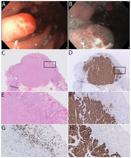 Figure 1. Endoscopic appearance of a polyp located at the major curvature with white light (A) and narrow band imaging (B). The HE stained sections (C,E), chromogranin A (D,F), and synaptophysin (H) sections demonstrated well-differentiated neuroendocrine tumour (NET) tissue combined with signet ring cell carcinoma. The proliferation rate evaluated by Ki-67 positivity in the NET component was up to 4% compared to 40% in the signet ring cell component (G). The black rectangle in (C) is seen at higher magnification as (E) and the black rectangle in (D) is seen at higher magnification as (F). The lower left half of (EH) contains NET tissue while the upper right part contains the signet ring cell carcinoma.