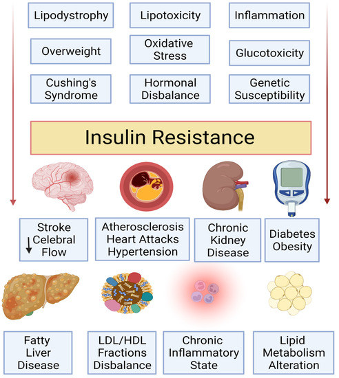 Diabetes is a chronic disorder that was the first non-communicable disease to be recognized by the United Nations as a 21st-century pandemic, and it develops either when the pancreatic β-cells do not secrete enough insulin or when the cells cannot productively use circulating insulin. Insulin is a hormone that maintains normal blood glucose levels by facilitating cellular glucose uptake and regulating carbohydrate, lipid, and protein metabolism. Hyperglycemia, commonly known as raised blood sugar level, is a common outcome of developing diabetes mellitus and continuously leads to mild-to-severe damage to many body organs, especially the nerves and blood vessel structures [1,2,3]. Insulin resistance (IR) is described as a defective physiological response to insulin stimulation of targeted cells, primarily these in the liver, muscles, and various types of adipose tissue. Insulin resistance impairs glucose release, leading to a compensatory increase in β-cell insulin secretion that, in turn, leads to a hyperinsulinemia state within the whole body. The metabolic impact of IR includes the resulting hyperglycemia, elevated blood pressure, dyslipidemia, visceral adiposity, innate and chronic inflammatory responses, endothelial layer function impairment, and dysregulation of the hemostasis balance [4,5,6]. Insulin resistance is believed to originate from muscle tissue with adaptive immune-related inflammatory states and a disbalance in free fatty acid metabolism, with subsequent ectopic lipid deposition [7]. An overview of the insights into the pathophysiology and outcomes of IR are shown in Figure 1.