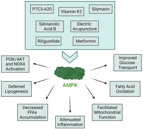 Thought-provoking mechanistic insights into IR complexity have been proposed by Lyu et al. [42], who showed that the phosphorylation of an sn-1,2-diacylglycerol/epsilon isoform of protein kinase C (PKCε)/insulin receptor at threonine at amino acid position 1160 promotes white adipose tissue IR in a mouse model. This finding is relevant for short-term IR induced by an HFD, as results showed that insulin retained the ability to suppress white adipose tissue lipolysis after a 7-day HFD. Lule et al. [43] revealed new hypothetical mechanisms for a protective role of Exenatide, a widely used GLP-1 receptor agonist, for the amelioration of IR-induced inflammation and non-alcoholic fatty liver disease (NAFLD). Namely, their study pointed out a significant effect in decreasing the degree of steatosis, decreasing the SOCS3 expression level, and increasing the Irs-1 expression level in Wistar rats treated with Exenatide. An interesting update for the action of metformin on IR was delivered by Khodadadi and Dludla [44,45,46]. Since the exact action mechanism behind the glucose-lowering effect of metformin is not clear, the authors proposed that metformin exerts its effects through the inhibition of mitochondrial respiratory chain complex 1 and the activation of AMP-activated protein kinase (AMPK). AMPK has been recognized in the past as a potential IR-related pathway [47], and novel findings confirm this as shown on Figure 3 [48]. It is worth noting that the mechanism mentioned is one amongst many exerted by metformin to prevent IR in humans. In support of this, the confirmation of a mitochondrial-dependent approach for IR treatment is broadly discussed by Yang and colleagues, who state that mitochondrial membranes are critical to regulating glucose-related metabolic processes [49]. Protective effects of metformin might be intensified by combining metformin with silymarin. Hüttl et al. [50] showed that the additive effect of silymarin in metformin therapy can mitigate fatty liver development in pre-diabetic states and before the onset of IR, due to positively affected transcription factors involved in lipogenesis (Scd-1, Srebp1, Pparγ, and Nr1h) and fatty acid oxidation (Pparα) [51]. Simultaneously, the significance of AMPK signaling was confirmed by Entezari et al. [52], who demonstrated the role of AMPK-signaling in enhancing insulin sensitivity and in inhibiting oxidative stress as well as cell death in β cells. Moreover, the authors underlined the importance of the AMPK pathway crosstalk with crucial molecular pathways, namely: PI3K/Akt, NOX4, and NF-κB. These findings are also supported by papers published in the past that proposed an involvement of AMPK signaling in insulin biology, speculating that these mechanisms had IR-protective consequences [53,54,55]. AMPK pathway targeting [56] was also investigated by Liu et al. using an alternative medicine approach, namely, electric acupuncture, which was proposed as an adjuvant therapy for hepatic IR targeting of AMPK via the rapamycin complex 1 (mTORC1)/ribosomal protein S6 kinase, 70-kDa (p70S6K) signaling pathway in a Zucker Diabetic Fatty rat model. Results show that despite the debatable role of acupuncture, it might be considered an effective way to prevent IR and improve energy metabolism per se. Another noteworthy approach to protect against hepatic IR seems to be the total knockdown or pharmacological inhibition of chromosome 9 open reading frame 72 (C9orf72), which that has been found [57] to be an inhibitor of lipophagy by activating the Cdc42/N-WASP axis to facilitate hepatic IR. An additional approach for hepatic IR treatment is riligustilide, which upregulates the AMPK-TORC2-FoxO1 axis to attenuate gluconeogenesis in vivo and in vitro, thus preventing hyperinsulinemia and IR [58,59].